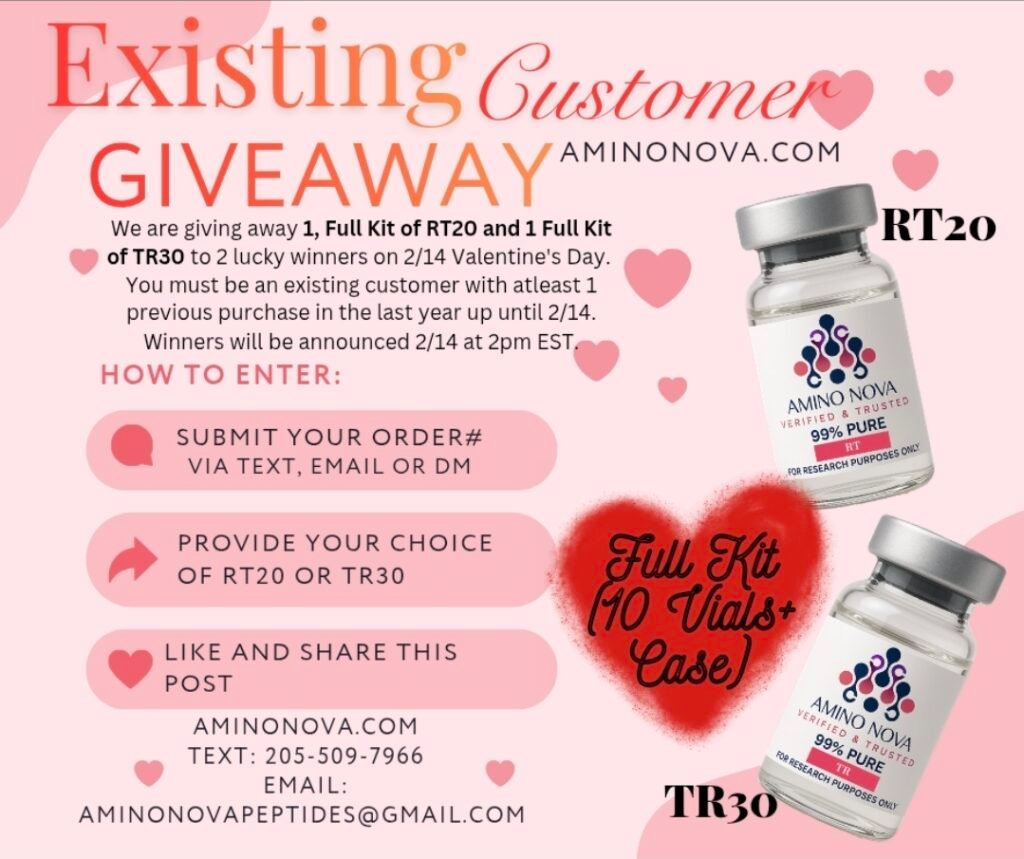 Love is in the air and Amino Nova is full of sprinkles. Enter to win the Existing Customer Giveaway, V-Day Edition. You must be an existing customer with atleast 1 purchase within the last year (Jan 1, 2025) until 2/14 2pm EST. Winners will be announced 2/14 2pm EST. 2 winners will be announced with 1 winner choosing RT20 and the other TR30. Message us today with your order# to enter at 205-509-7699 or AminoNovaPeptides@gmail.com. Good luck everyone.