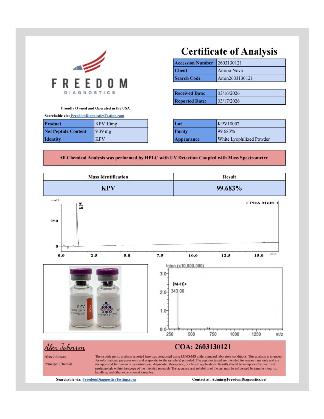 Discover the high-quality of KPV designed exclusively for advanced research applications. At Amino Nova, we are committed to providing top-tier scientific products to support your innovative research projects. Please note that this product is for research purposes only and not intended for human or animal use. Our trustworthy and professional service ensures you receive reliable and effective materials for your next breakthrough. Explore the difference with Amino Nova, where quality and precision meet excellence. Lyophilized powder 3ml vial