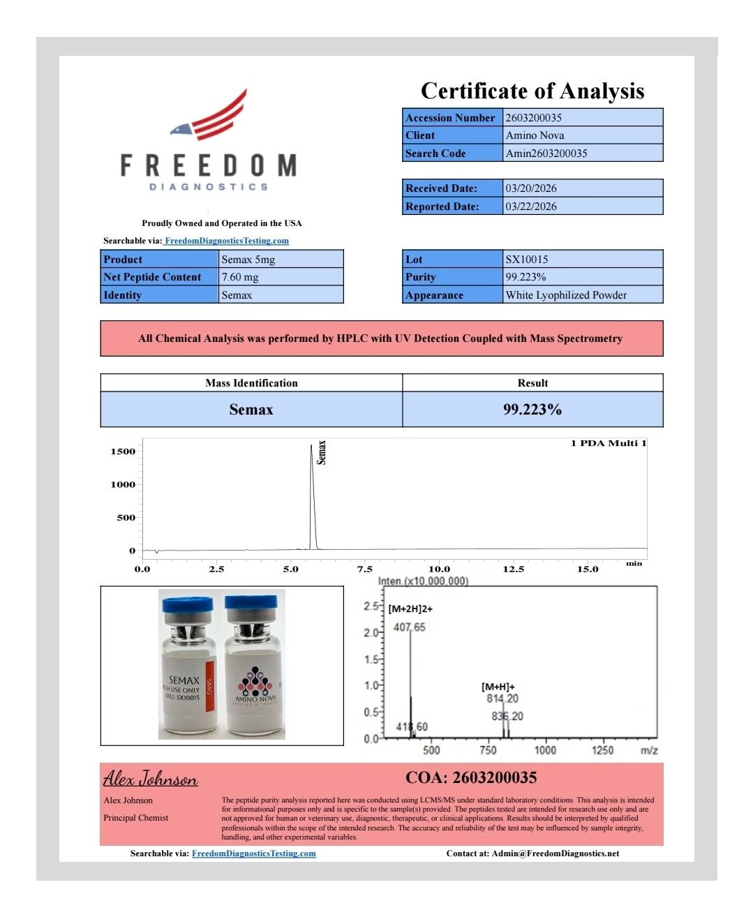 Discover the high-quality of Semax, designed exclusively for advanced research applications. At Amino Nova, we are committed to providing top-tier scientific products to support your innovative research projects. Please note that this product is for research purposes only and not intended for human or animal use. Our trustworthy and professional service ensures you receive reliable and effective materials for your next breakthrough. Explore the difference with Amino Nova, where quality and precision meet excellence.